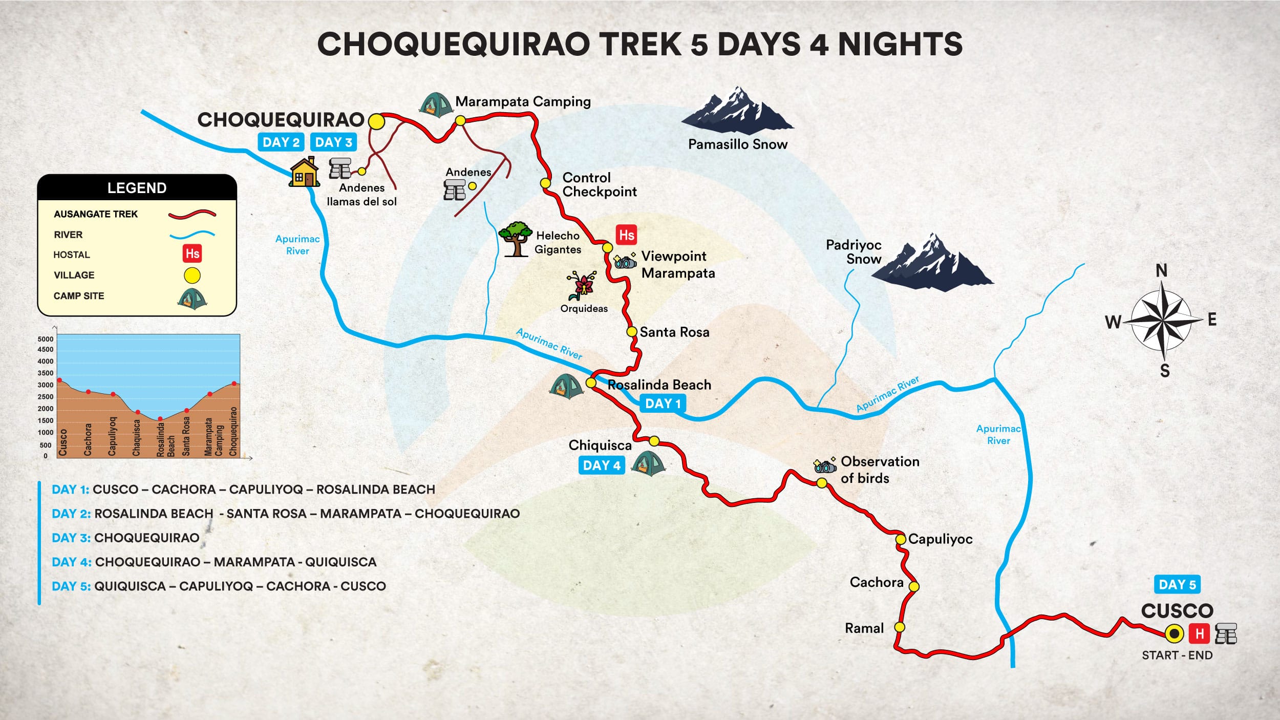After lunch, we continue our journey towards Rosalina’s beach (1,500 meters above sea level) to cross the Apurímac River, where it is quite warm, and then ascend for 2 hours, covering 3 kilometers, to the village of Santa Rosa. During this part of the trek, we will have the opportunity to enjoy magnificent views, beautiful landscapes, warm weather, glaciers of the Vilcabamba mountain range, and the impressive Apurímac canyon. Here, we will set up our first camp and enjoy dinner.