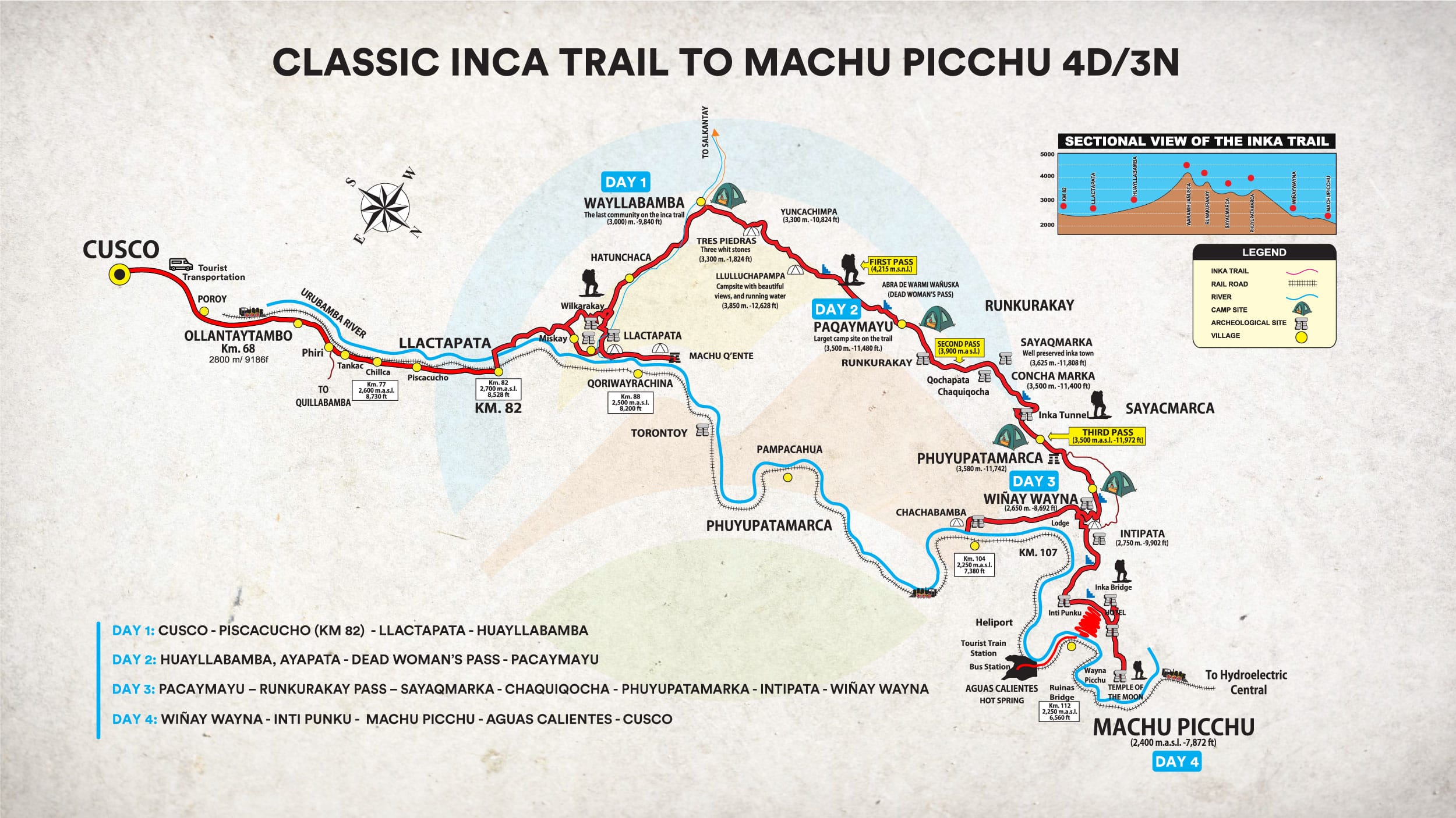 The Inca Trail 4 days has a distance of 40 km which is divided day by day. The most complicated day is the second day as you ascend to the highest pass of the walk, this pass is called Warmiwañusca (dead woman’s pass) and is at 4223 meters above sea level.