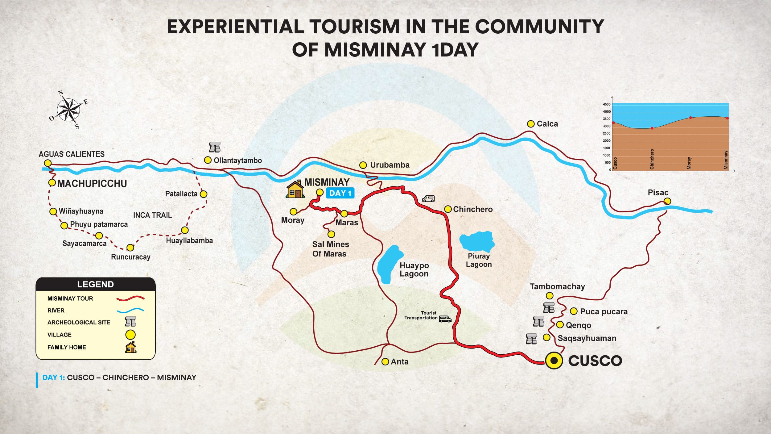 A Comunidade Camponesa de Misminay está localizada a aproximadamente 1 hora e 30 minutos da cidade de Cusco, a 54 km de distância, e está situada a uma altitude de 3.700 m.a.n.m. No caminho, visitaremos o distrito de Maras, onde poderemos apreciar uma paisagem natural única desta região andina, privilegiada por possuir o maior manto de estrelas de todo o Cusco. Misminay é uma comunidade que mantém vivas suas tradições ancestrais, com famílias que conservam uma relação íntima com a natureza por meio da agricultura, utilizando técnicas tradicionais de cultivo em terraços. O idioma predominante em Misminay é o quéchua.