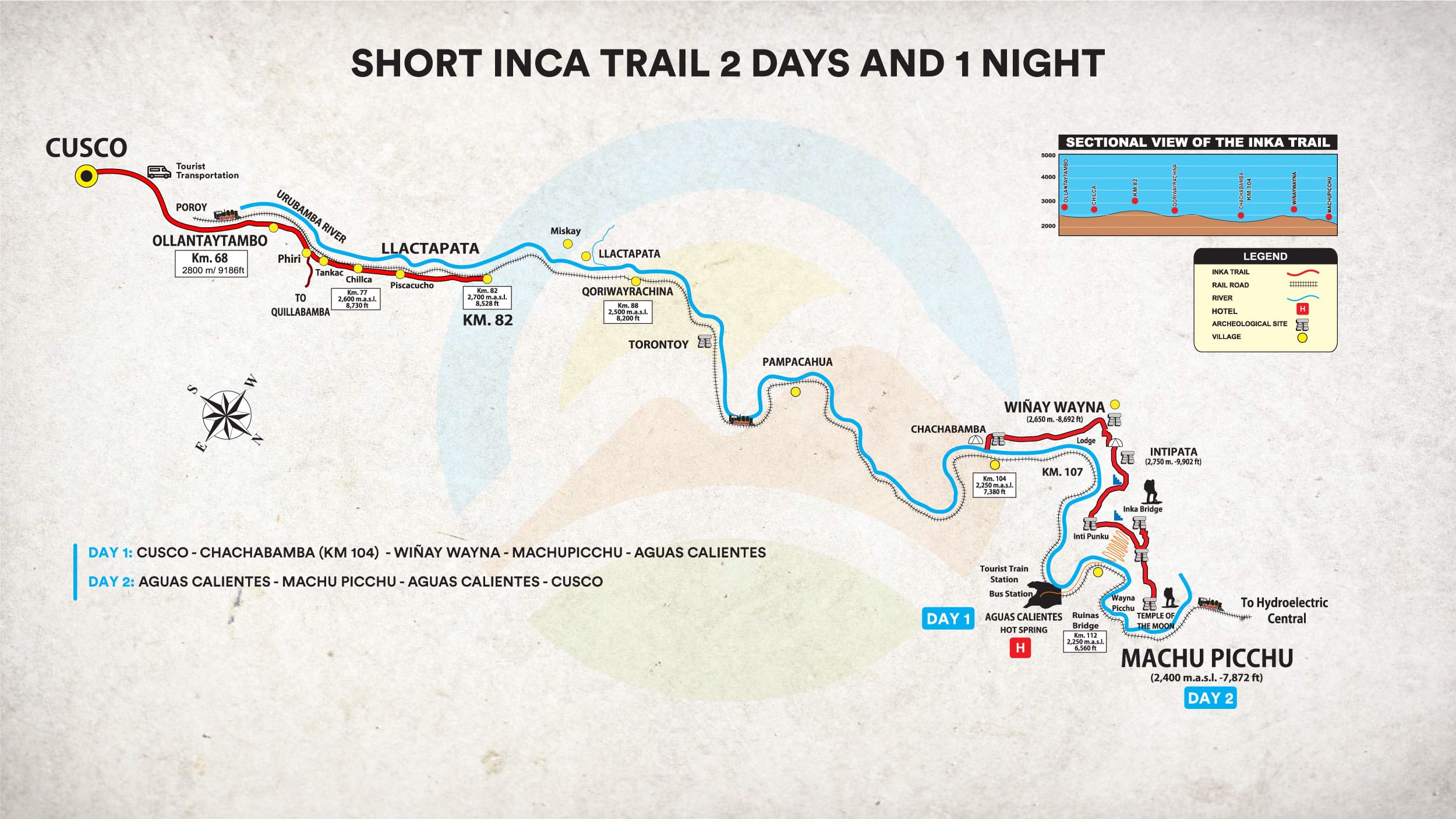Yes, this trek does not require as much physical effort as the 4 – Day Inca Trail. The maximum altitude will be approximately 2,400 meters above sea level, and you will pass through a subtropical landscape. The hike will be on the first day only, covering about 9 km with rest periods.
