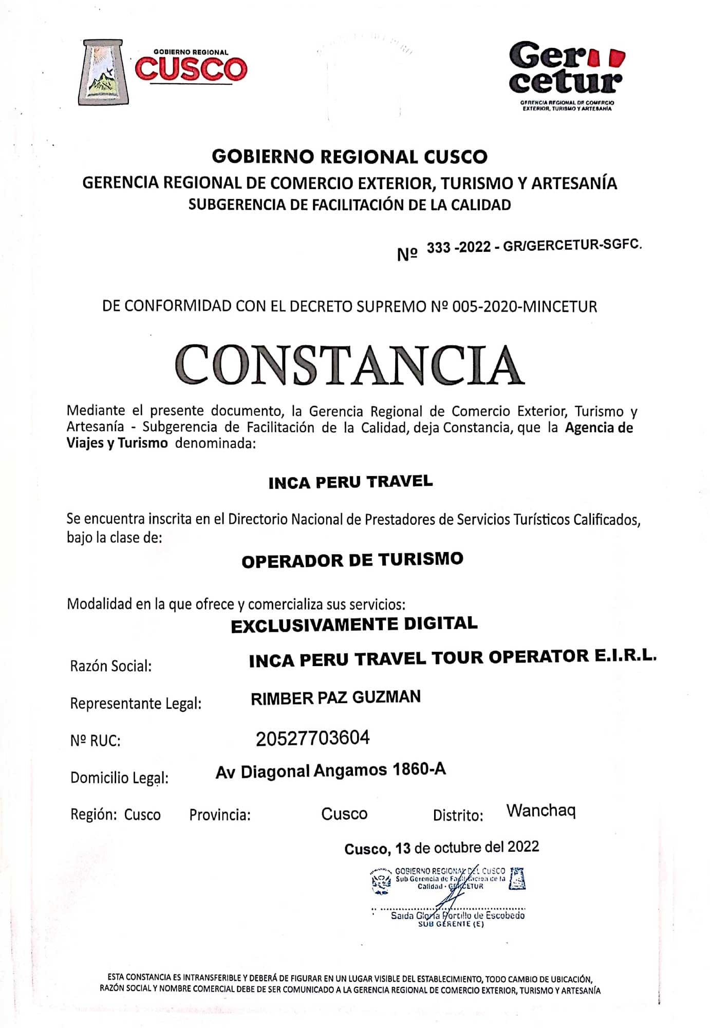 Operador Autorizado de servicios turísticos en la Red de Camino Inca
