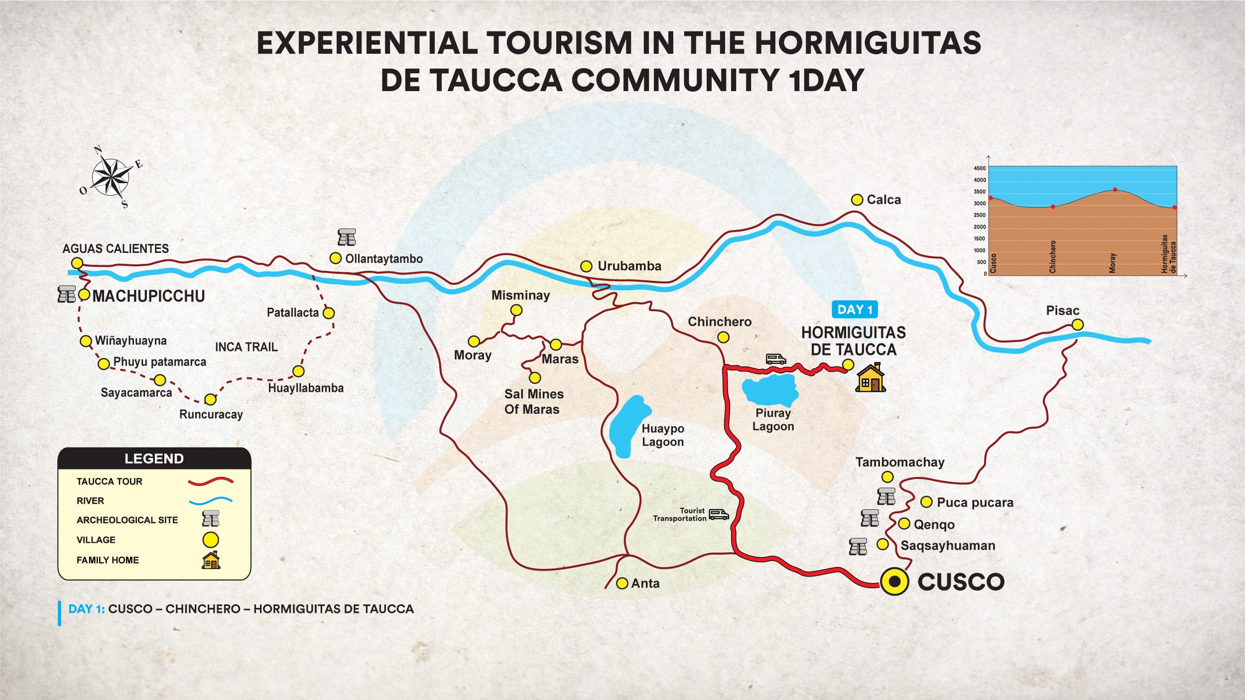 A Associação de Turismo Comunitário Formiguinhas de Taucca (3762 m de altitude) está localizada na Comunidade Campesina de Taucca, no distrito de Chinchero, na cidade de Cusco. A comunidade de Taucca é uma pequena e pitoresca vila andina que mantém vivas suas tradições ancestrais, sendo muito conhecida por sua atividade agrícola: cultivo de batata, milho, fava, cevada e trigo.